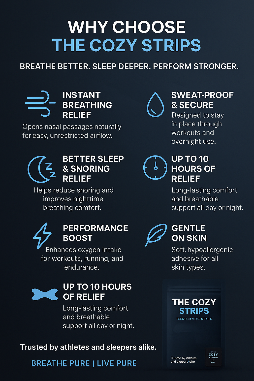Discover The Cozy Strips — your new nighttime essential for deep, refreshing rest. Designed with ultra-soft, skin-friendly material and gentle adhesive, these nasal strips open your airways naturally, reducing snoring and stuffiness. Whether it’s for bedtime, workouts, or allergy season, Cozy Strips help you breathe freely and sleep soundly — no effort, just comfort.